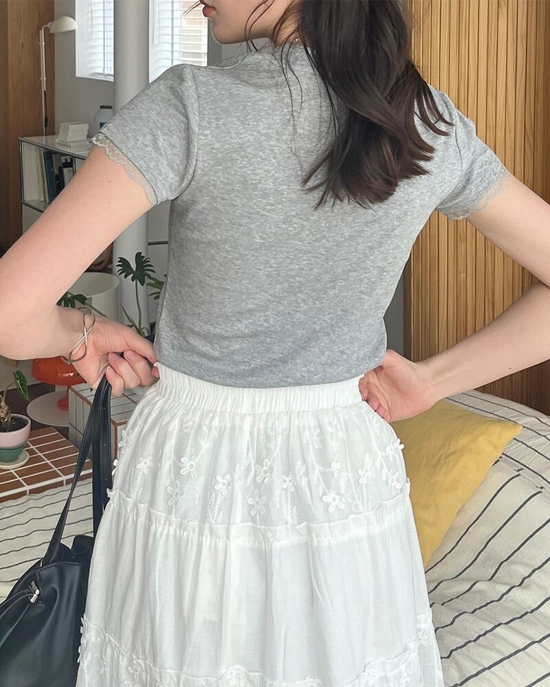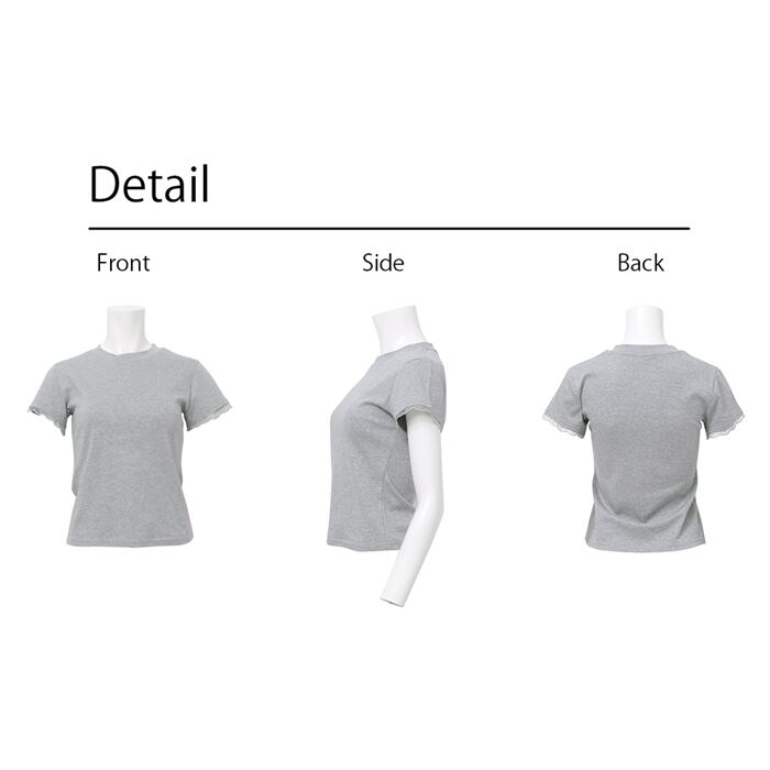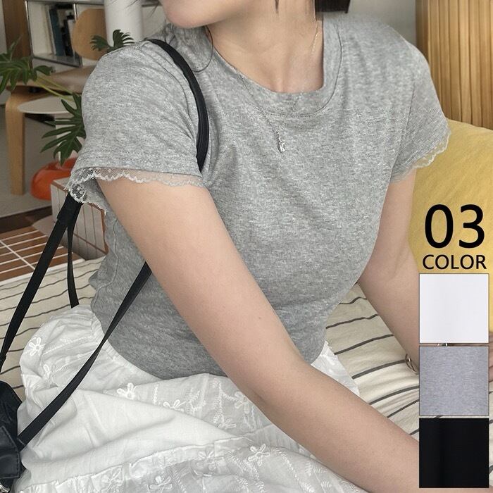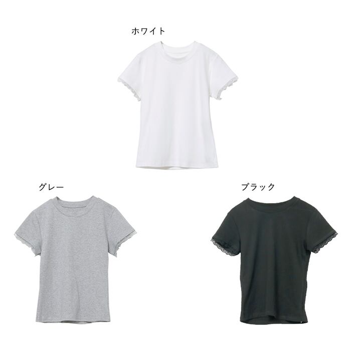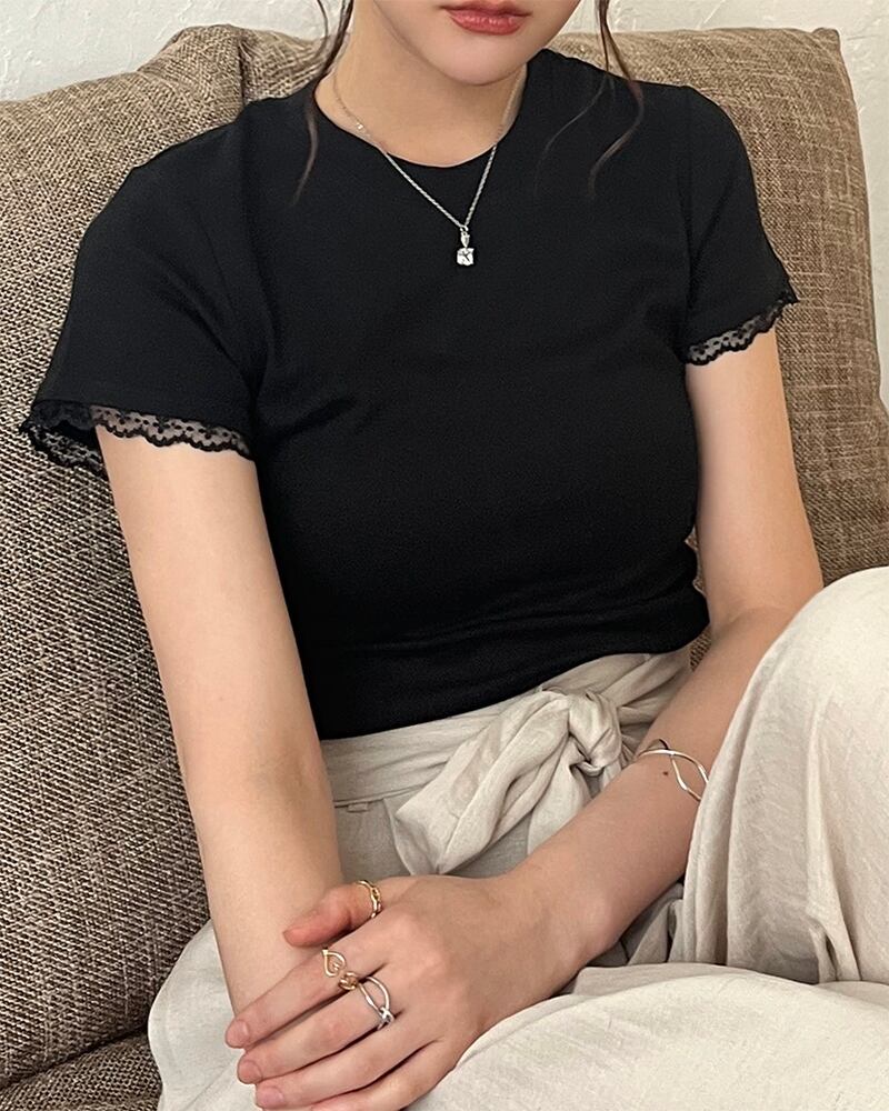 袖にレースをあしらったTシャツ。