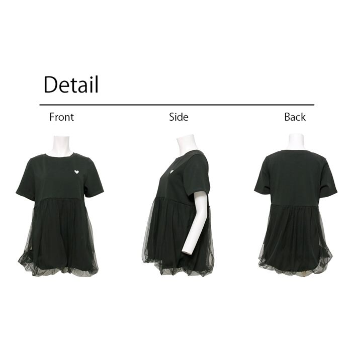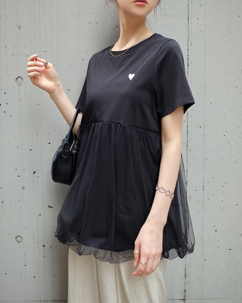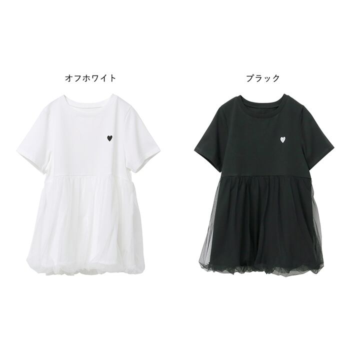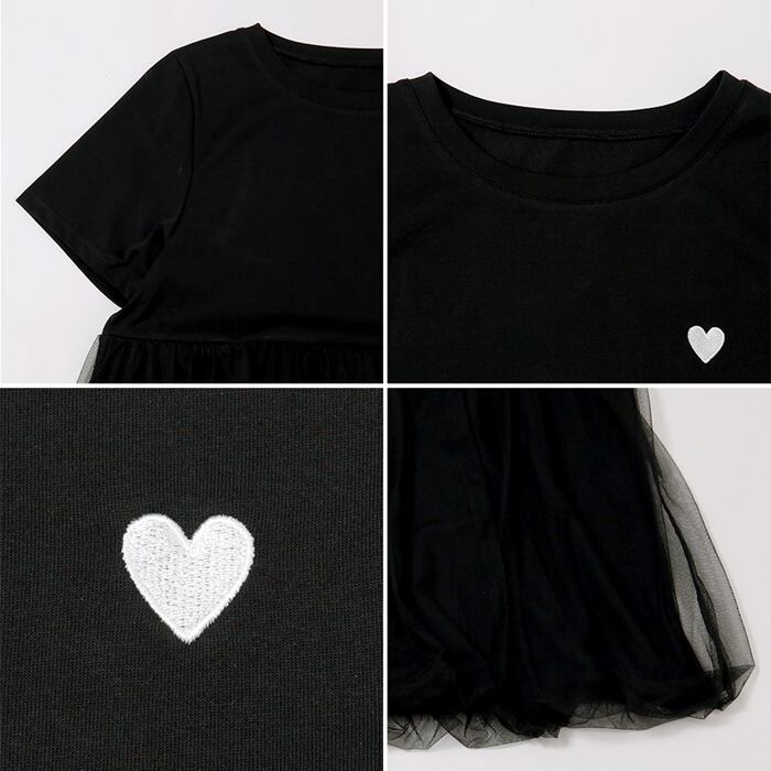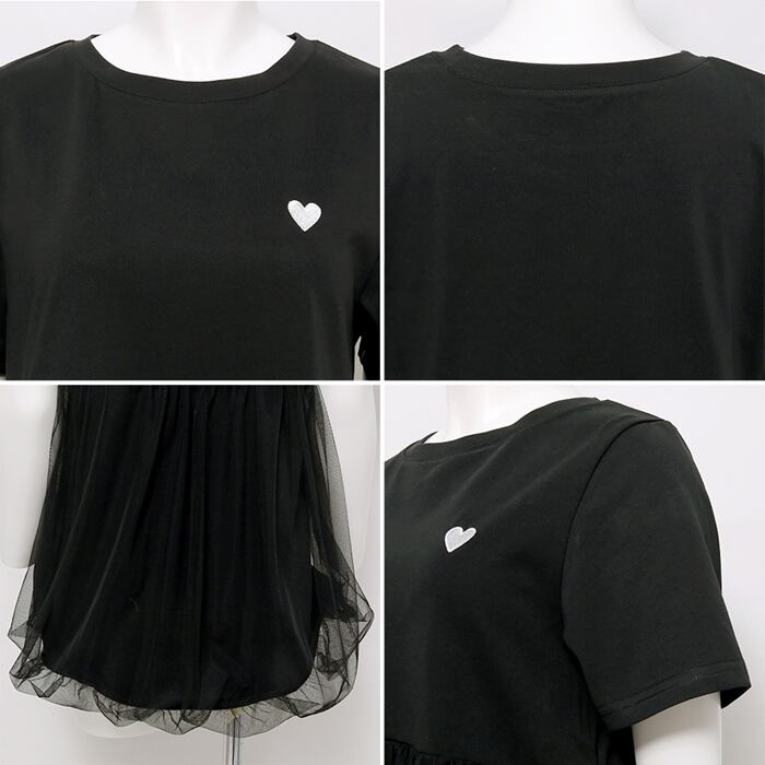 ハートのポイント刺繍が目を惹くチュールドッキングバルーンTシャツ。