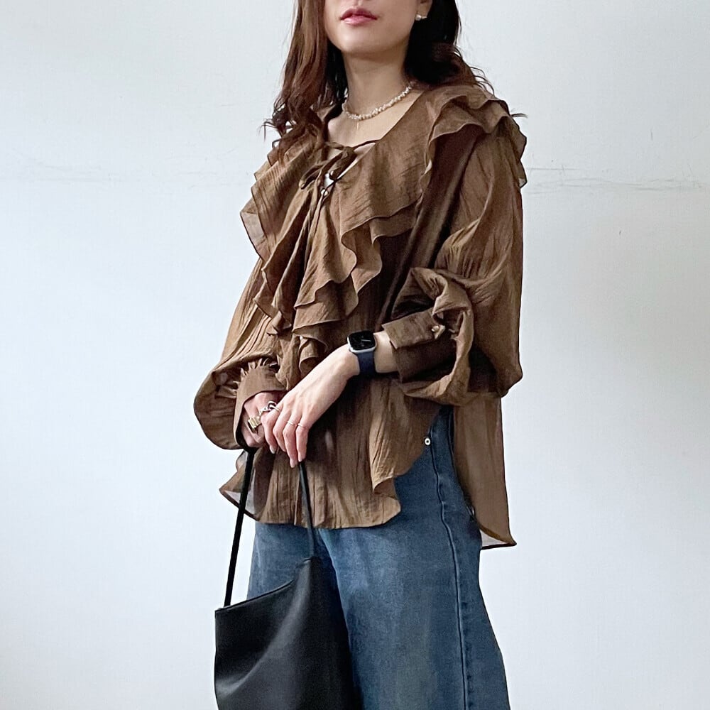 優雅なラッフルカラーが特徴のシアーブラウスです。軽やかな素材感が春夏コーデにぴったりで、レイヤードスタイルにも最適!カジュアルにも、少しきれいめにも幅広く活躍します。