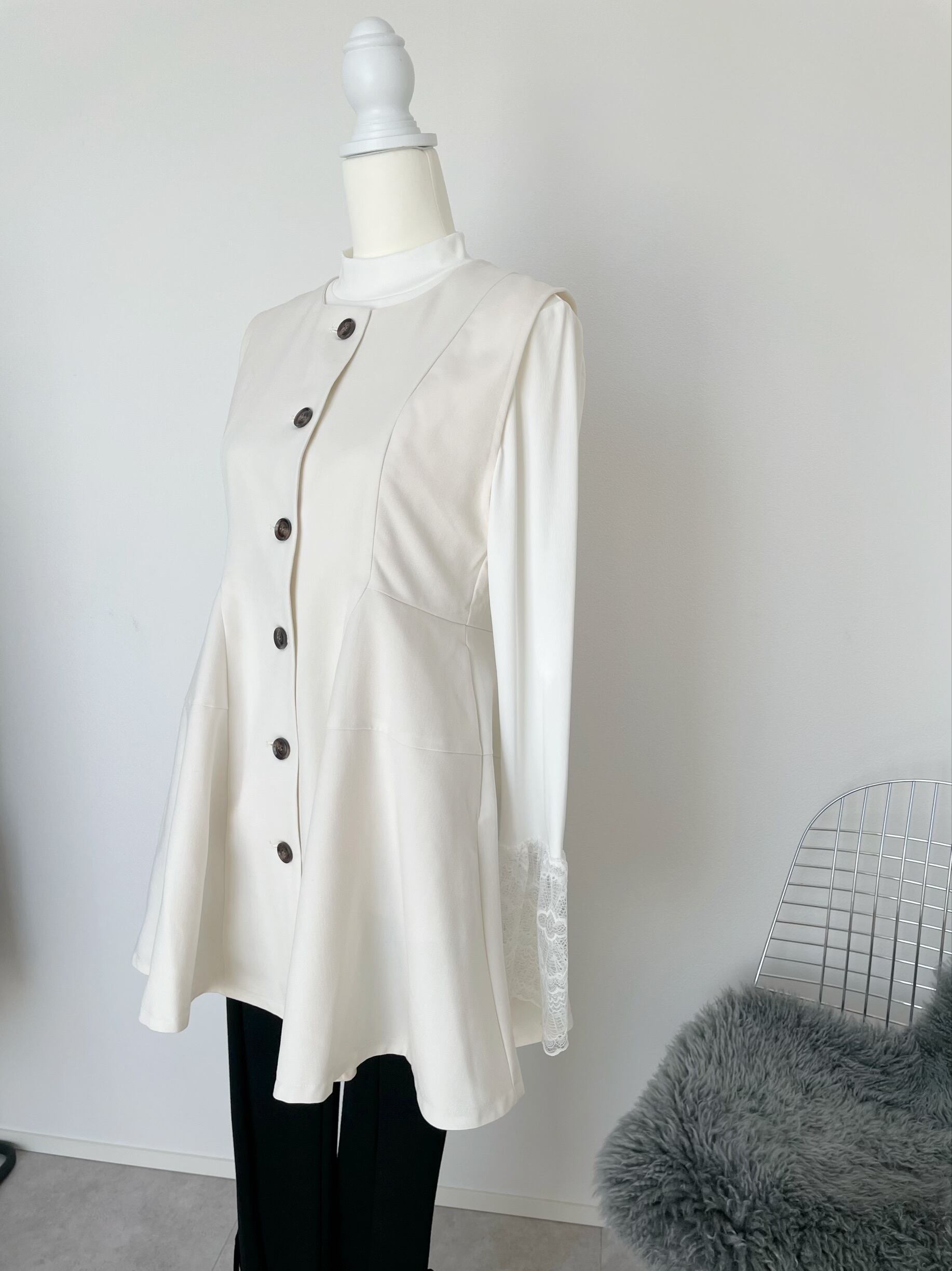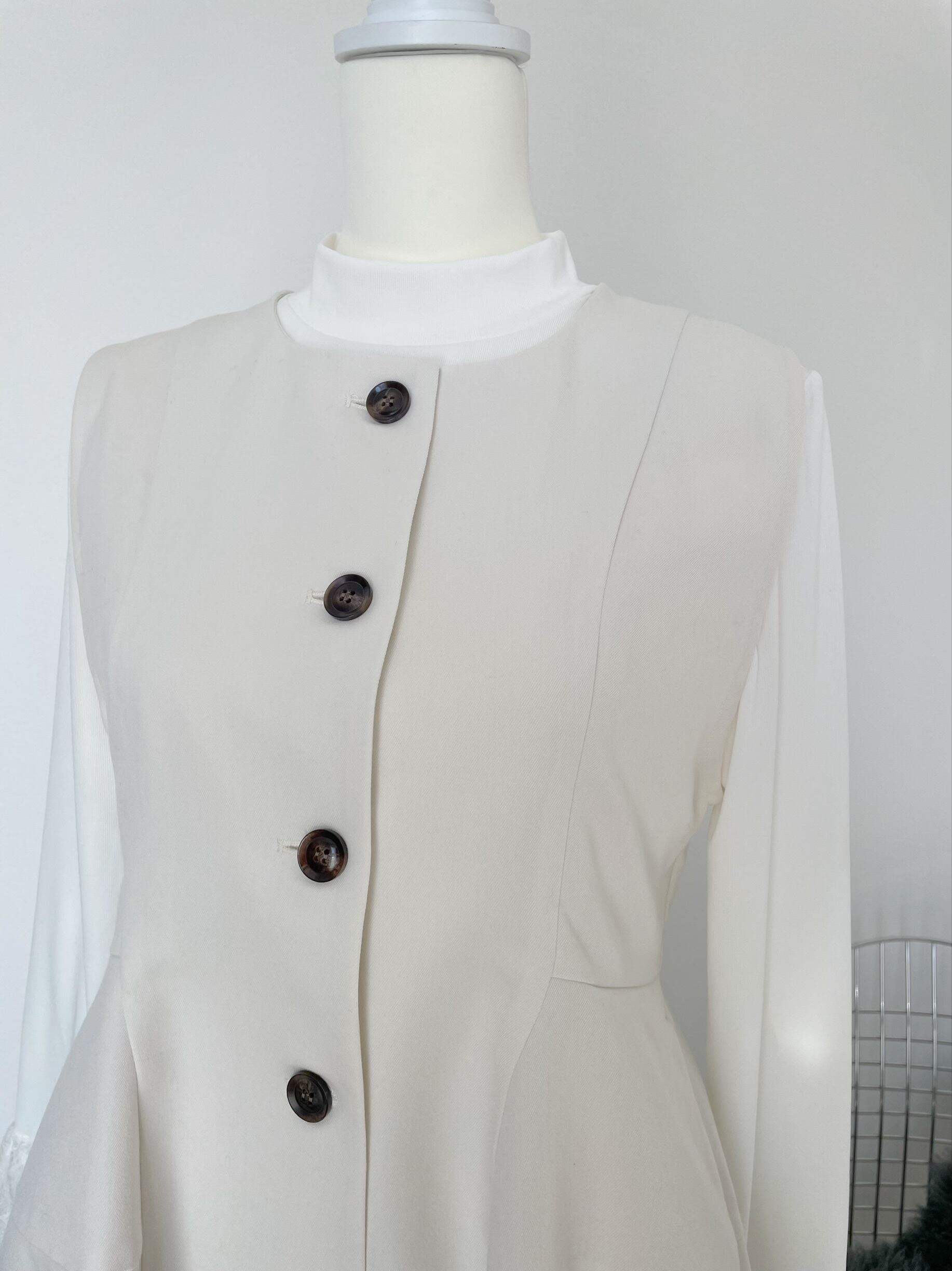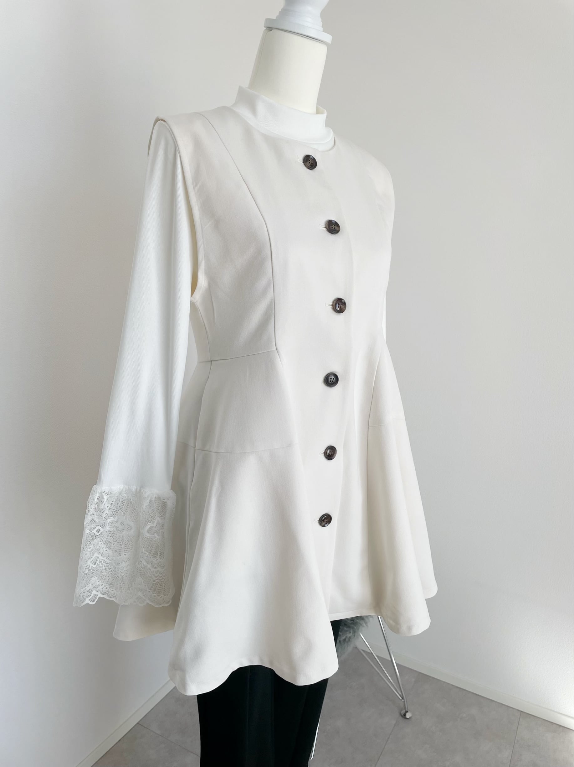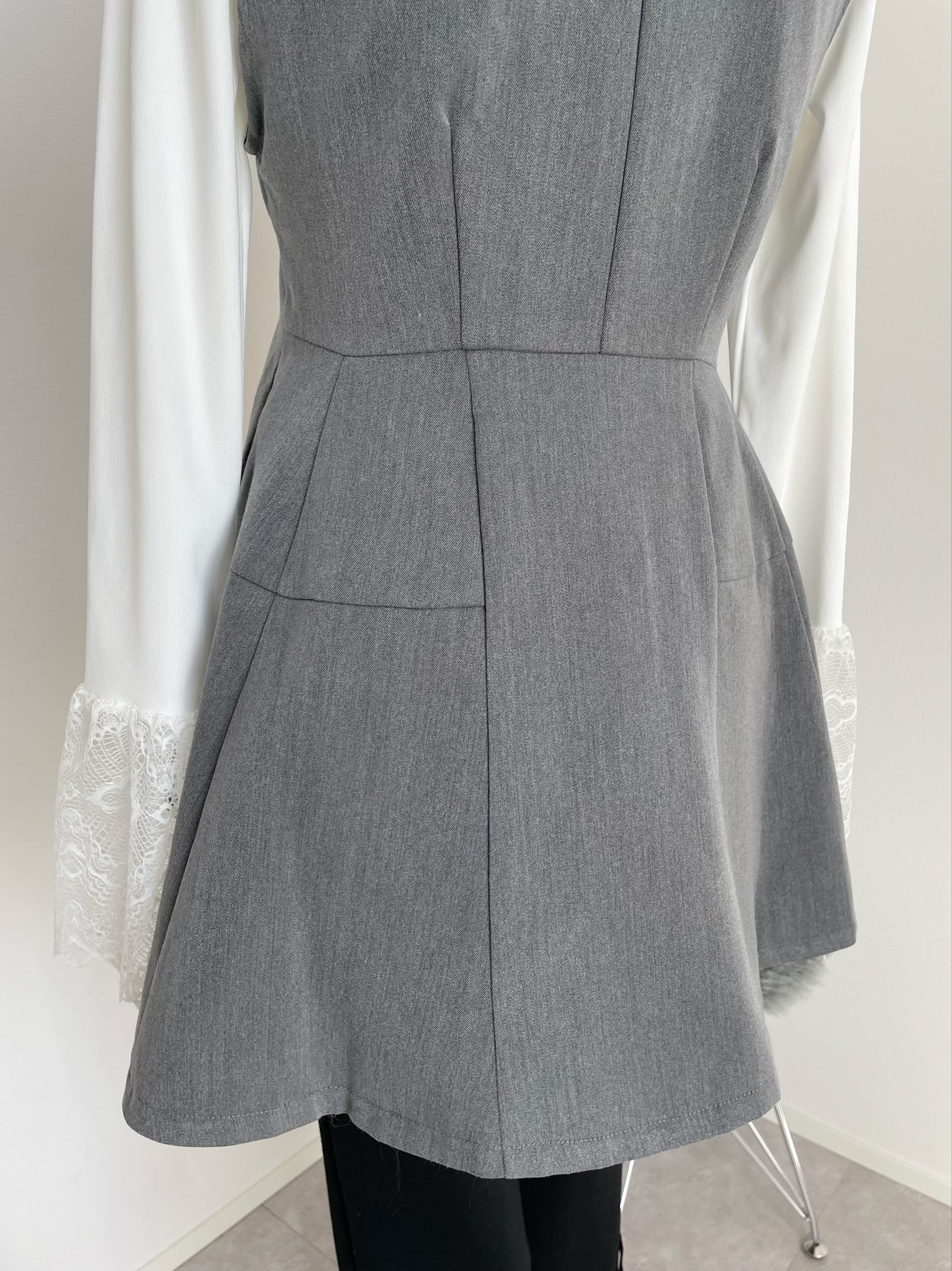 ペプラムデザインでウエストの美しいラインと流れるようなフレアラインが魅力のジレです。