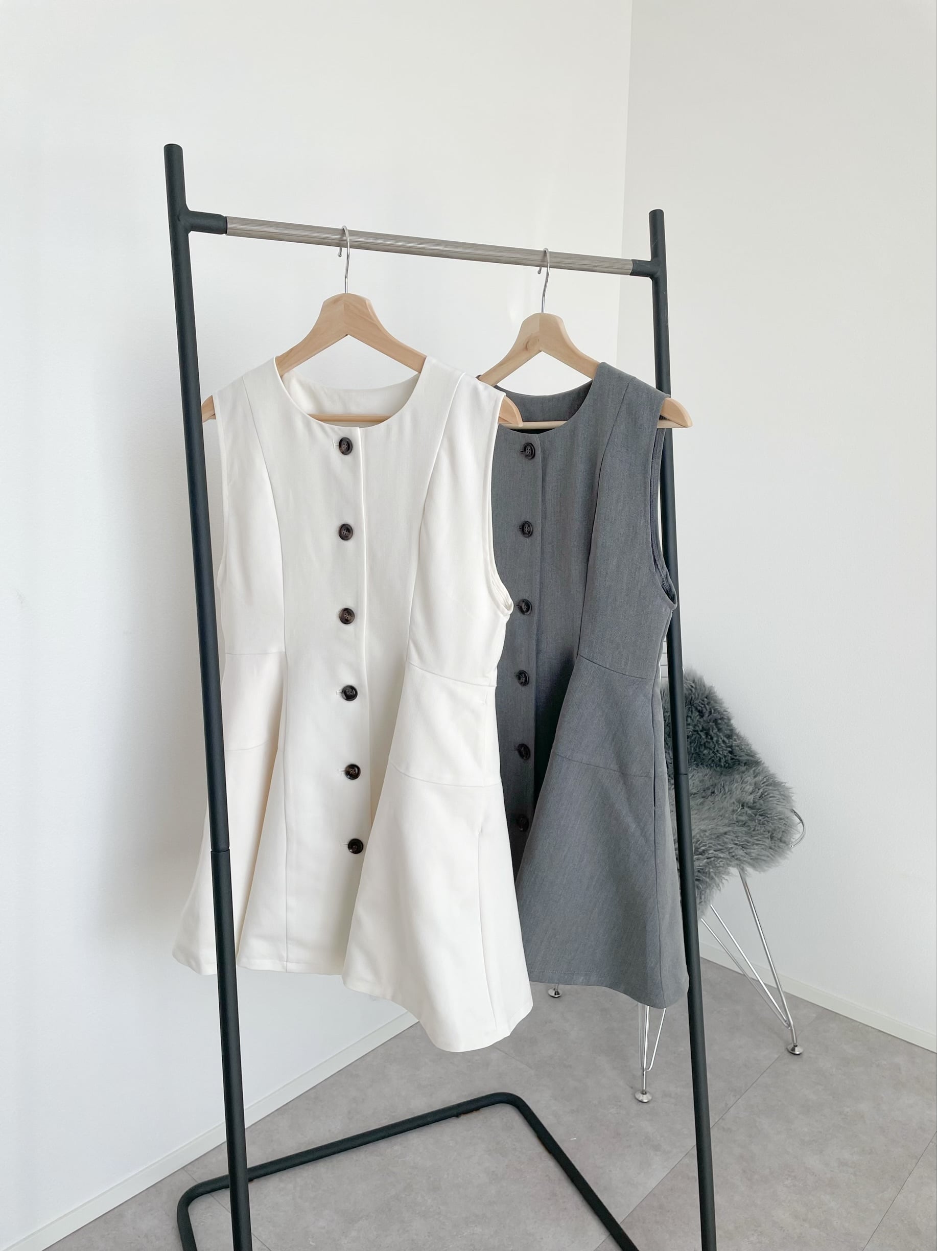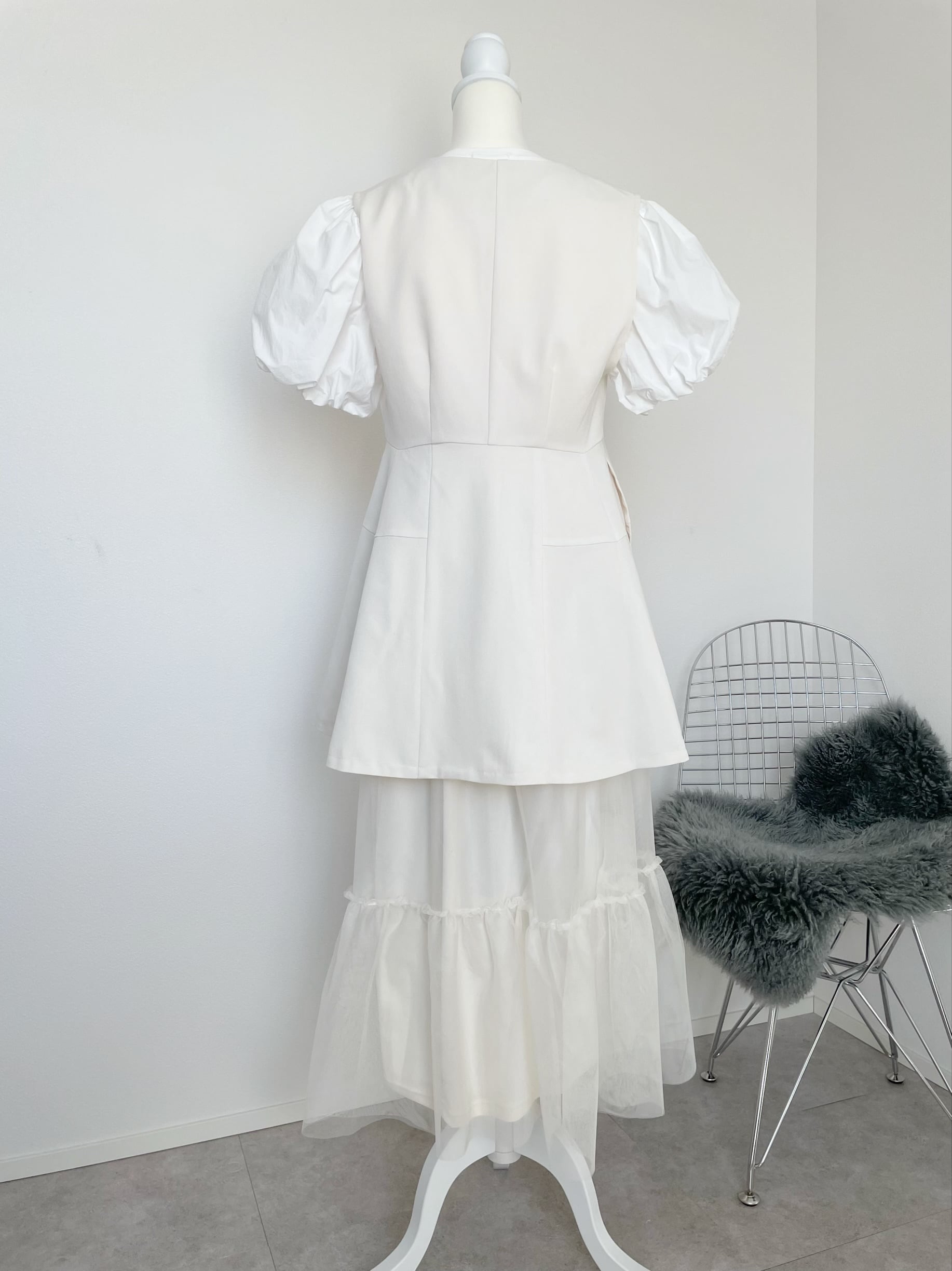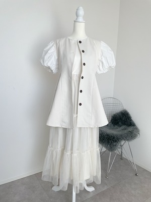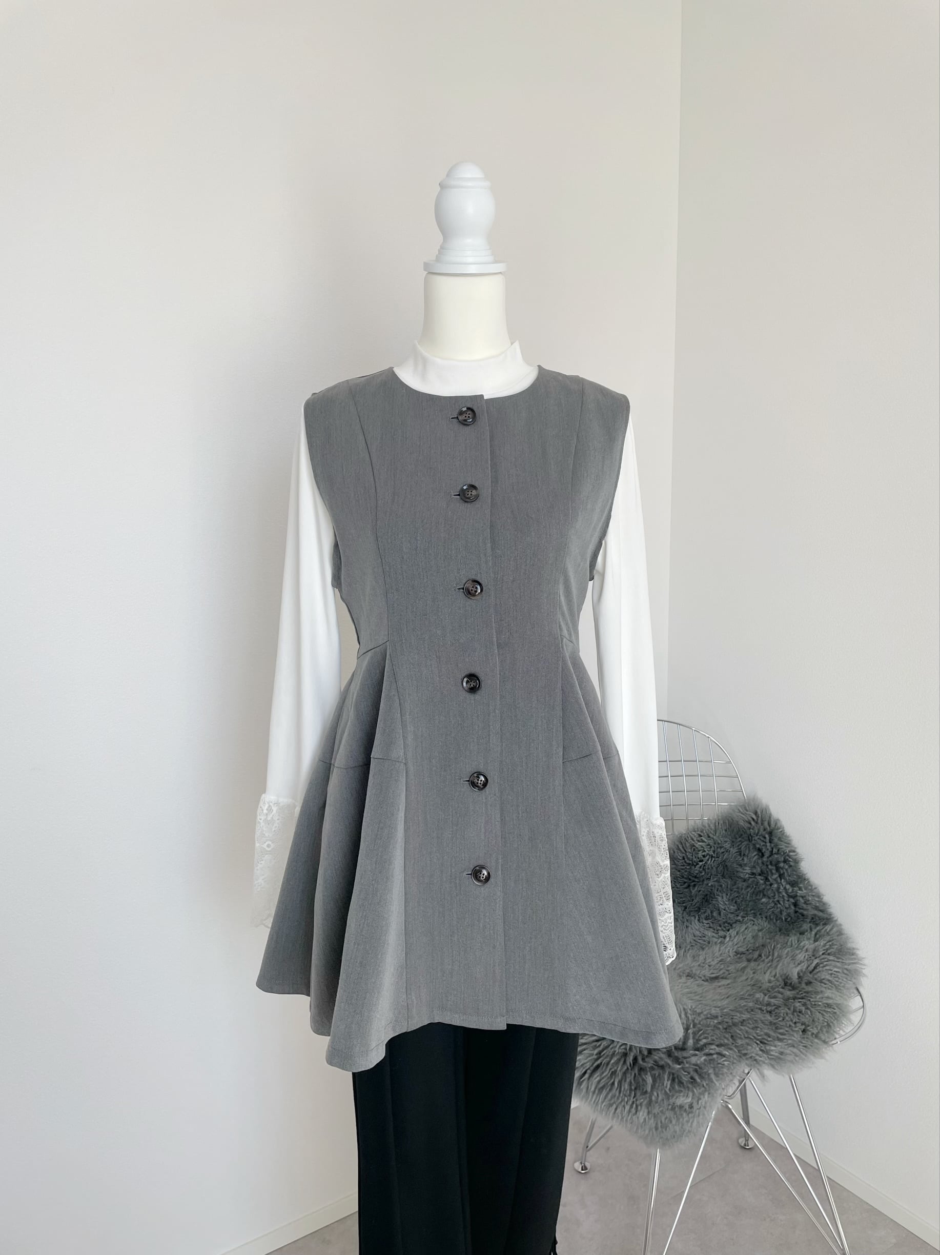 ペプラムデザインでウエストの美しいラインと流れるようなフレアラインが魅力のジレです。
