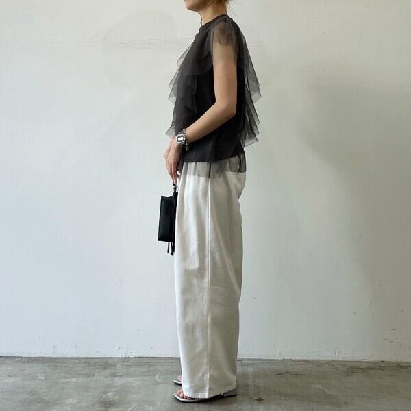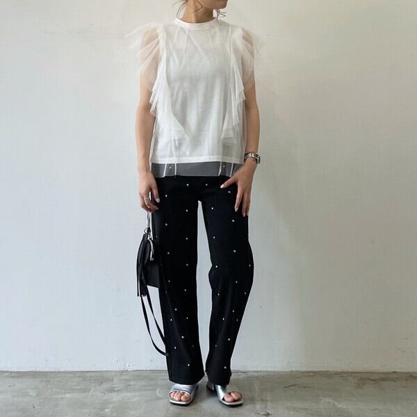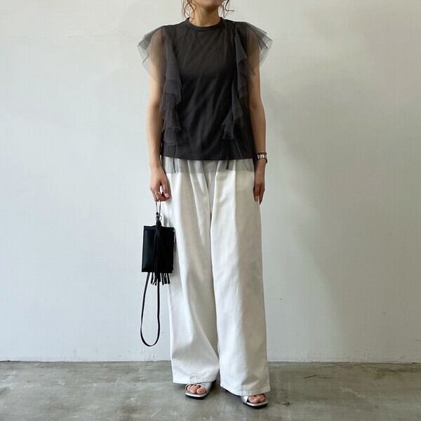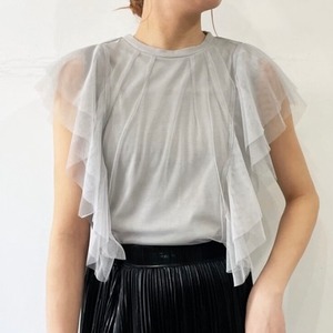 Tシャツ生地にチュールのフリル袖がドッキングされたガーリー×カジュアルなアイテム。