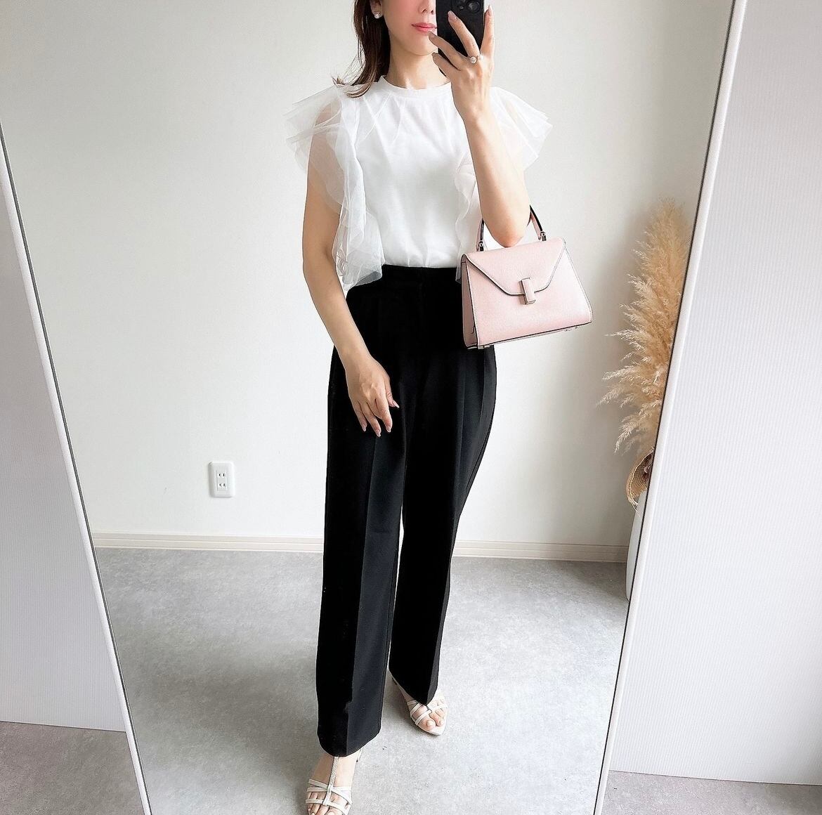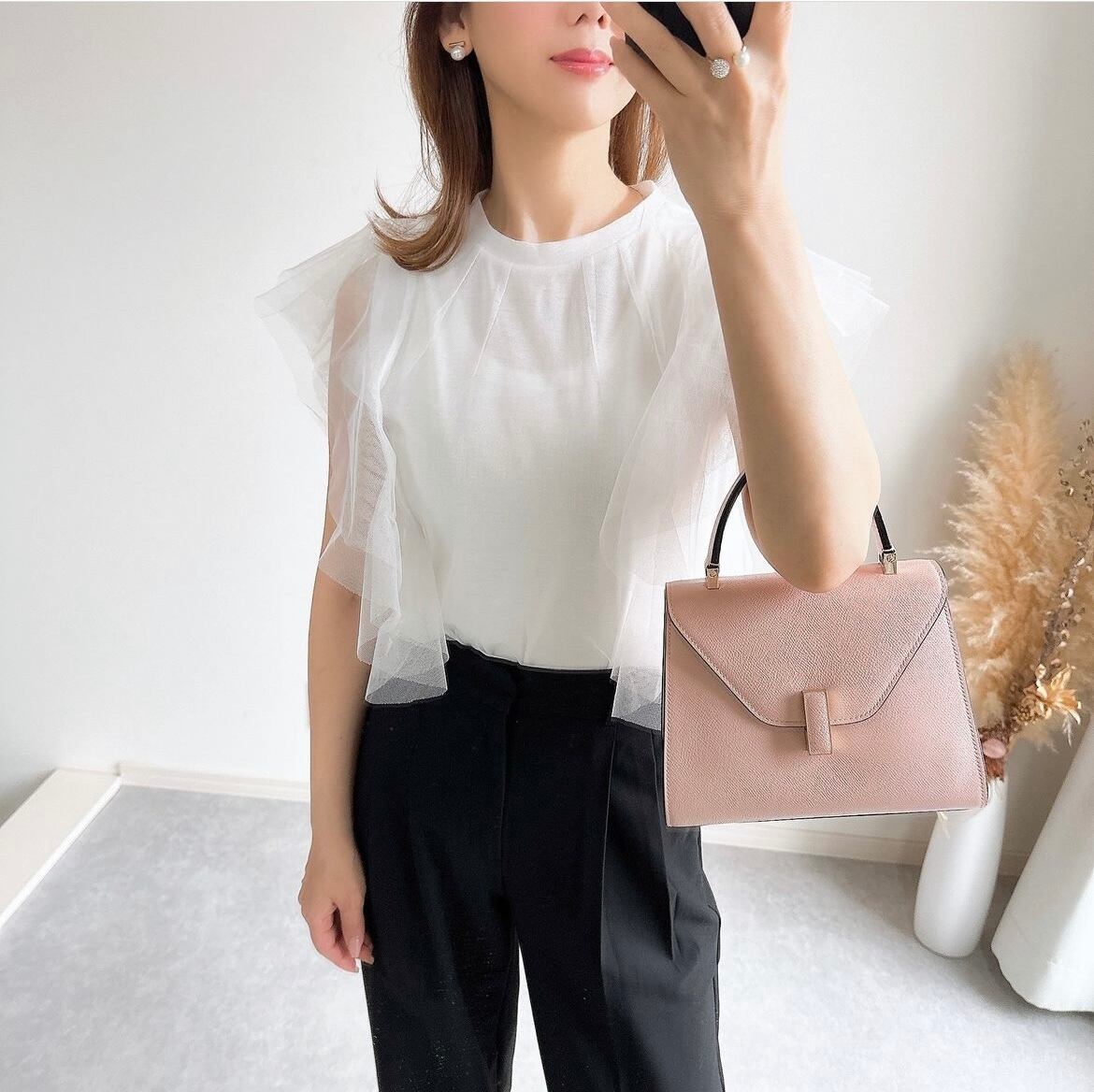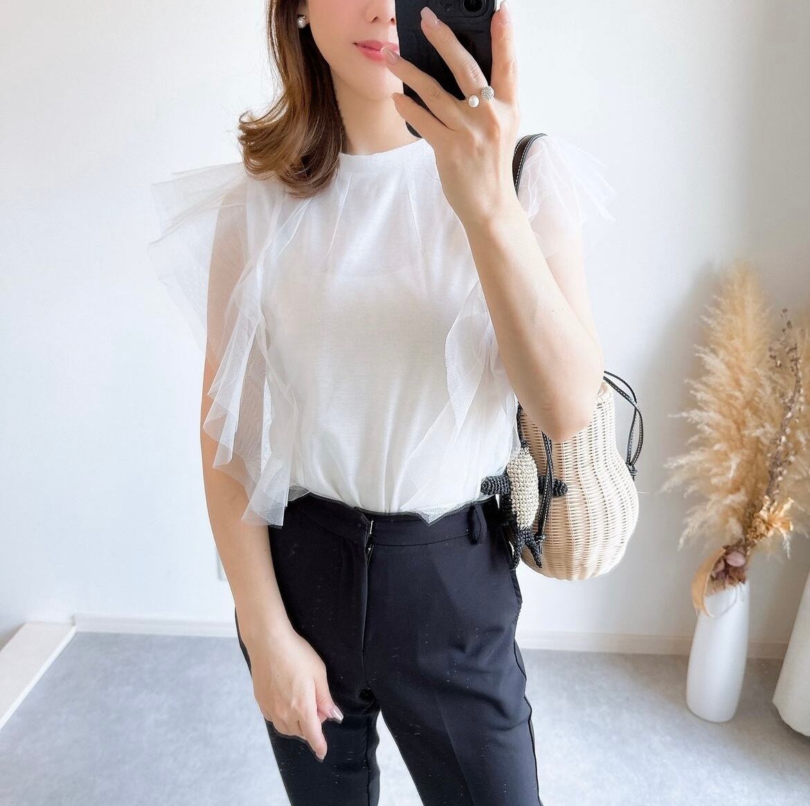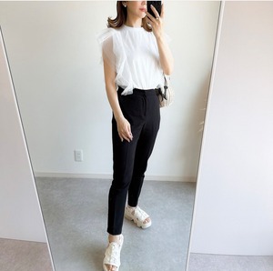 フリルがアクセントとなり、シンプルながらも華やかなデザインが特徴のデザイントップス です。